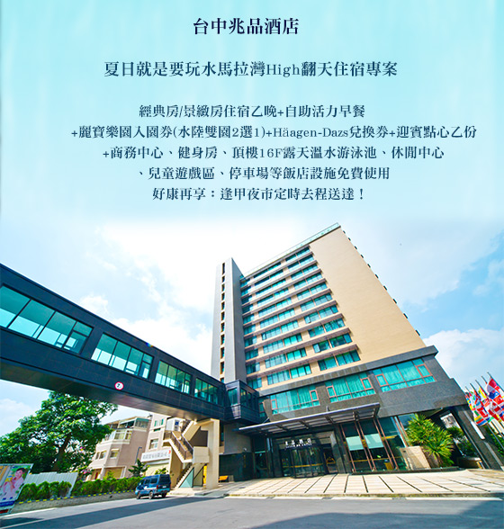 只要3,599元(雙人價)即可享有【台中兆品酒店】原價7,100元夏日就是要玩水馬拉灣High翻天住宿專案:經典房/景緻房住宿乙晚+自助活力早餐+麗寶樂園入園券(水陸雙園2選1)+H?agen-Dazs兌換券+迎賓點心乙份+商務中心、健身房、頂樓16F露天溫水游泳池、休閒中心、兒童遊戲區、停車場等飯店設施免費使用。好康再享:逢甲夜市定時去程送達!